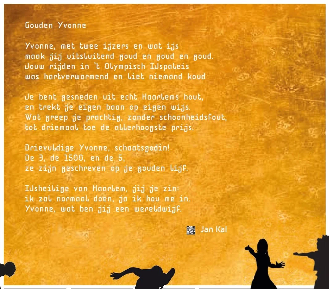 De in Haarlem geboren en getogen dichter Jan Kal (1946) tekende voor het sonnet. Jan schreef deze ode aan de koningin van de winterspelen in 1988. Nu, na 34 jaar, is dit lofdicht vereeuwigd op de noordwand van het Mendelcollege. Jan Kal is Nederlands meest productieve schrijver van sonnetten. Hij heeft er meer dan vijftienhonderd op zijn naam staan. Hij schrijft ook regelmatig over sport.